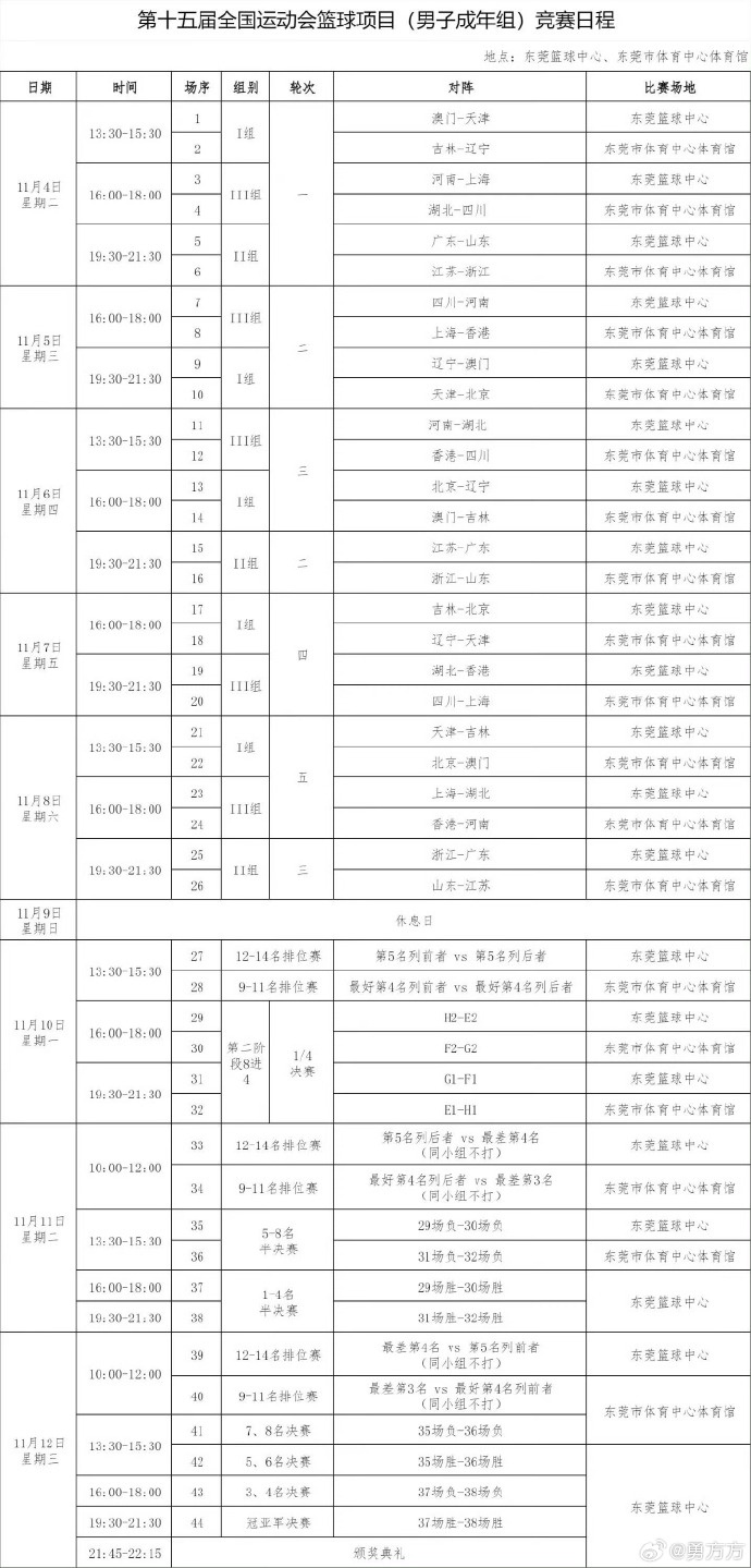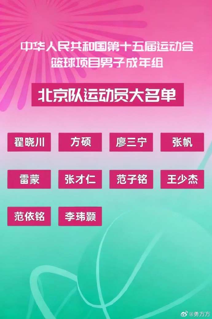 足球比分网11月1日讯 今天,BTV记者@勇方方 在社媒上晒出了北京全运男篮的参赛名单。 @勇方方 在个人微博上写道:“今日出征前往东莞,丘天和邹雨宸确定缺阵,不出意外就是名单上这些位出战啦,第一场比赛下周三开打,全运加油,力争好成绩!”