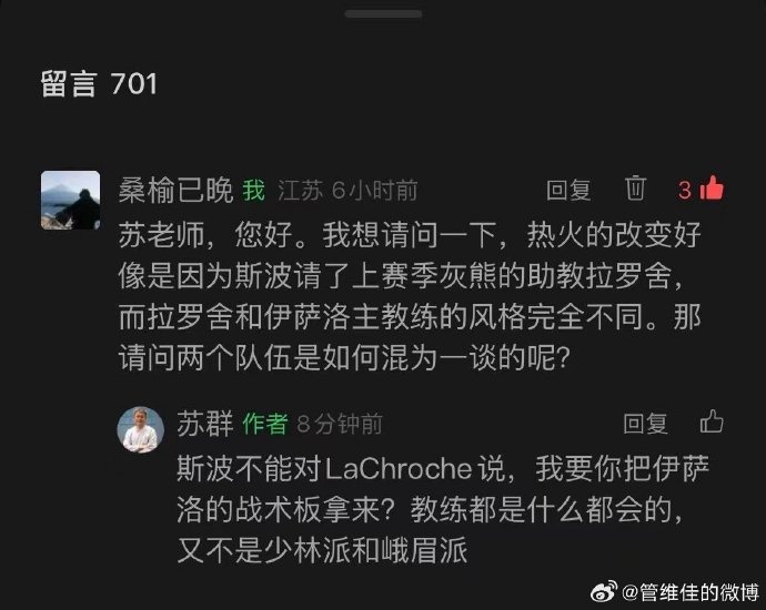 管维佳今日揭晓了答案,他晒出自己在苏群文章下的留言,两人进行了互动:
