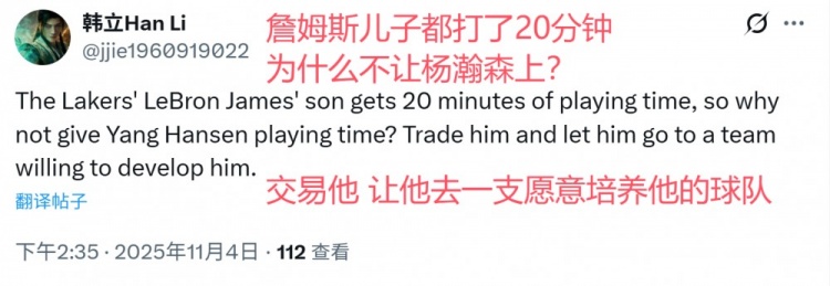 美网友:布朗尼都打20分钟为啥不让杨瀚森上?我