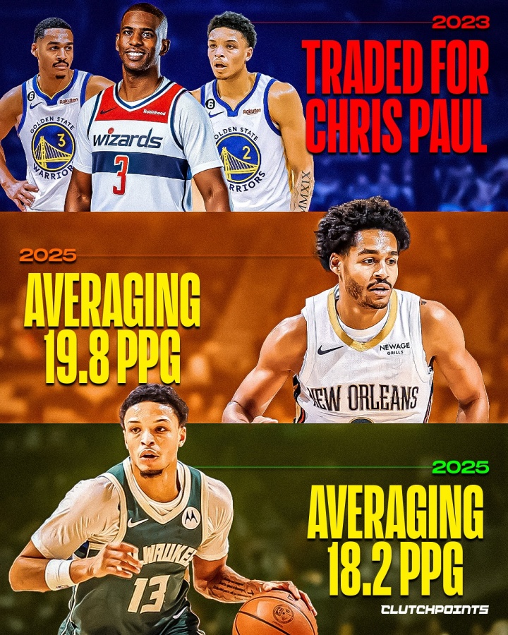 2023年7月,勇士将普尔、鲍德温、罗林斯、2030年首轮签、2027年次轮签送到奇才,换回保罗; 一年后,保罗被勇士裁掉; 本赛季,普尔场均18.3分1.7板3.0助(图片数据有滞后),罗林斯场均18.2分3.7板5.5助。