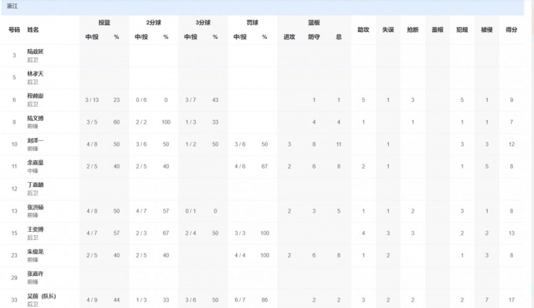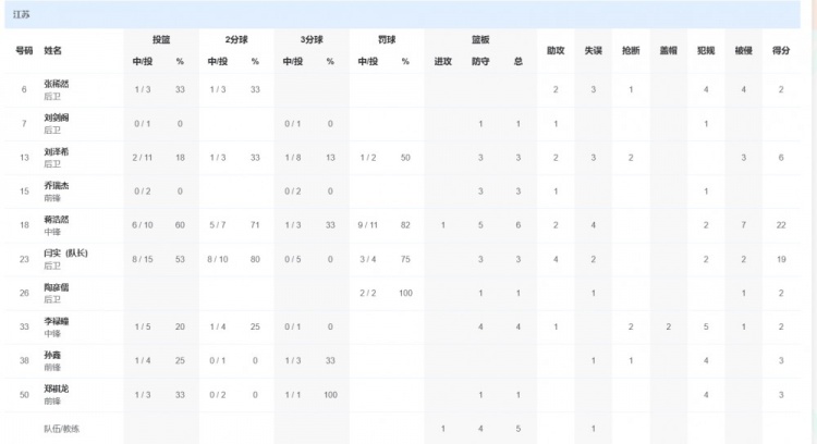 江苏队方面,蒋浩然22分6篮板2助攻;闫实19分3篮板4助攻;刘泽希6分3篮板2抢断。