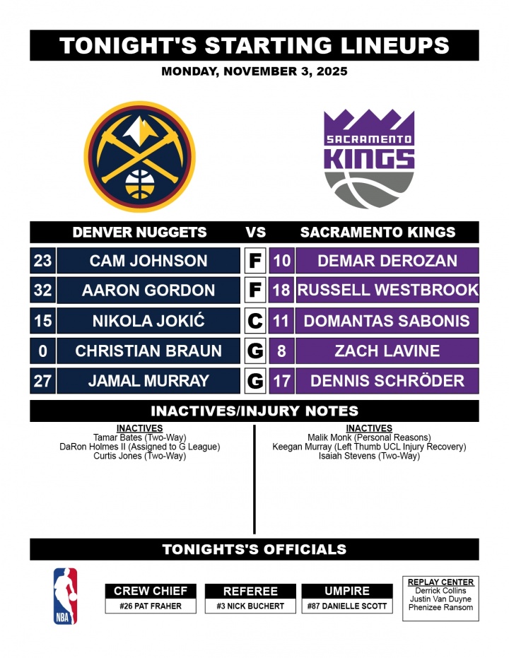 足球比分网11月04日讯 NBA常规赛,国王将于10:00客场挑战掘金。 赛前,NBA官方公布了两队首发: 国王首发:丹尼斯-施罗德、扎克-拉文、德玛尔-德罗赞、拉塞尔-威斯布鲁克(大前锋)、多曼塔斯-萨博尼斯 掘金首发:贾马尔-穆雷、克里斯蒂安-布劳恩、卡梅隆-约翰逊、阿隆-戈登、尼科拉-约基奇 |