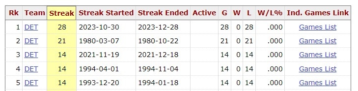 活塞:28连败 2023年10月到12月,活塞曾有一波28连败,目前这一连败和76人的28连败并列为NBA历史连败纪录,同时活塞的28连败为历史单赛季连败纪录,76人的28连败为历史跨赛季连败纪录。