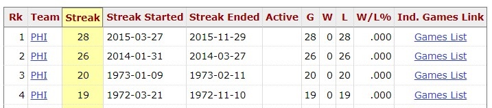 今天结束的一场NBA常规赛,鹈鹕106-137惨败雷霆。此役输球之后,鹈鹕苦吞开季6连败。加上上赛季常规赛收官阶段的7连败,他们已经连输13场,追平了队史连败纪录。 细数NBA的各支球队,几乎每个队都有过惨痛的连败经历,今天,老震和大家一起回顾一下NBA各队的连败纪录。 湖人:10连败(两次) 湖人的队史连败纪录是10场,一次是2015-16赛季,从16年1月中旬到1月底连输了10场;一次是1993-94赛季,1994年4月份遭遇了一波10连败。 步行者:12连败(4次) 步行者队史上一共有过4次12连败,最近的一次是2021-22赛季到2022-23赛季的跨赛季12连败,另外3次分别在1982-83赛季、1984-85赛季、1988-89赛季。 鹈鹕:13连败(两次) 除了这次的跨赛季13连败,鹈鹕还在2019-20赛季遭遇过一波13连败。 国王:14连败(两次) 国王的两次14连败都出现在远古时期,一次在1959-60赛季,一次在1971-72赛季,那时候还叫辛辛那提皇家队。 开拓者:14连败 2012-13赛季到2013-14赛季,开拓者遭遇过一波跨赛季14连败。 雷霆:14连败(3次) 雷霆至今有过3次14连败,一次是07-08赛季,一次在08-09赛季,一次在2021年4月。 雄鹿:15连败 雄鹿在上世纪遭遇过1次15连败,那是在95-96赛季。 老鹰:16连败 老鹰的队史连败纪录也出现在远古时期,1975-76赛季遭遇过16连败。 公牛:16连败 2000-01赛季,公牛遭遇过一波16连败。 奇才:16连败(4次) 奇才的队史连败纪录也是16连败,一共有4次,一次在09-10赛季,另外3次都在最近几年,23-24赛季1次,上赛季两次。 勇士:17连败 1964-65赛季,勇士经历过一波17连败。 热火:17连败 1988-89赛季,热火经历过一次17连败。 猛龙:17连败 1997-98赛季,猛龙曾有过17连败。 太阳:17连败 2019年1月到2月,太阳曾有一次17连败。 爵士:18连败 1982年2月到3月,爵士曾惨遭18连败。 凯尔特人:18连败 2007年1月到2月,凯尔特人曾有过18连败。 森林狼:18连败 2010-11赛季到2011-12赛季,森林狼曾有过跨赛季18连败。 马刺:18连败 马刺此前的连败纪录是13场,但在2023年,他们有一波16连败(2022-23赛季),还有一波18连败(2023-24赛季)。 魔术:19连败 2003-04赛季,魔术曾惨遭19连败。 篮网:19连败 新泽西篮网时期,球队有过19连败,那是08-09赛季到09-10赛季的跨赛季19连败。 火箭:20连败 2021年2月到3月,火箭曾有过20连败。 快船:20连败 93-94赛季到94-95赛季,快船曾有跨赛季20连败。 独行侠:20连败 1993年11月到12月,独行侠曾有过20连败。 尼克斯:20连败 1984-85赛季到85-86赛季,尼克斯曾有跨赛季20连败。 灰熊:23连败 进入NBA的第一个赛季(95-96赛季),灰熊曾有过23连败,那时还叫温哥华灰熊。 黄蜂:23连败 2012年3月到4月,黄蜂有过一次23连败。 掘金:23连败 1997-98赛季,掘金曾有过23连败。 骑士:26连败 2010-11赛季,即詹姆斯第一次离开骑士的第一年,骑士曾有过26连败,从2010年12月下旬到2011年2月上旬,球队连续输了26场。 76人:28连败 本世纪的第二个十年里,76人曾有一段“相信过程”的时期,2014年1月到3月,球队曾有一次26连败,2014-15赛季到15-16赛季,他们曾跨赛季28连败。