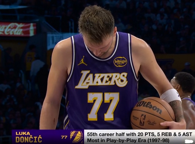 湖人主场迎战马刺,上半场东契奇砍下22分6篮板7助攻,据转播方统计,这是东契奇生涯第55次半场砍下20+5+5,是自97-98赛季有统计以来最多的。