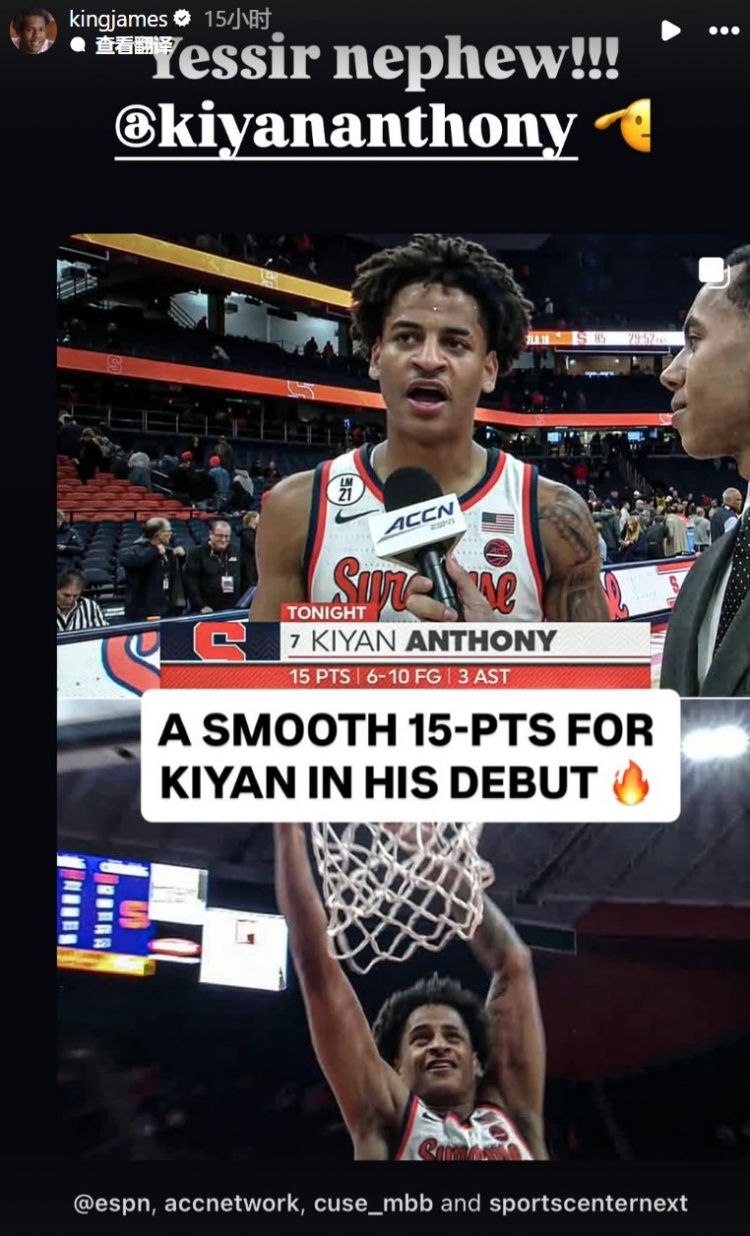 足球比分网11月5日讯 在昨天的一场NCAA比赛中,雪城大学85-47大胜宾汉顿大学。卡梅隆·安东尼之子基扬·安东尼完成了大学正式比赛的首秀。 湖人球星勒布朗·詹姆斯在INS转发了基扬的首秀数据并写道:“好样的小侄子!!!@基扬 |