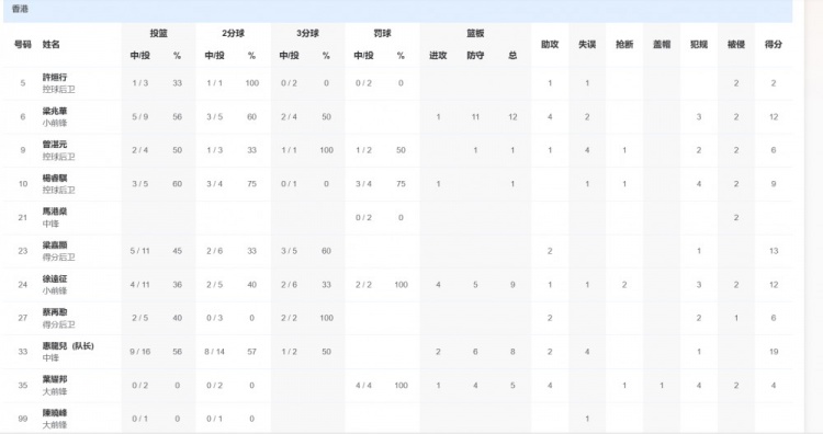 中国香港队方面,惠龙儿19分8篮板2助攻,徐远征12分9篮板1助攻2抢断。