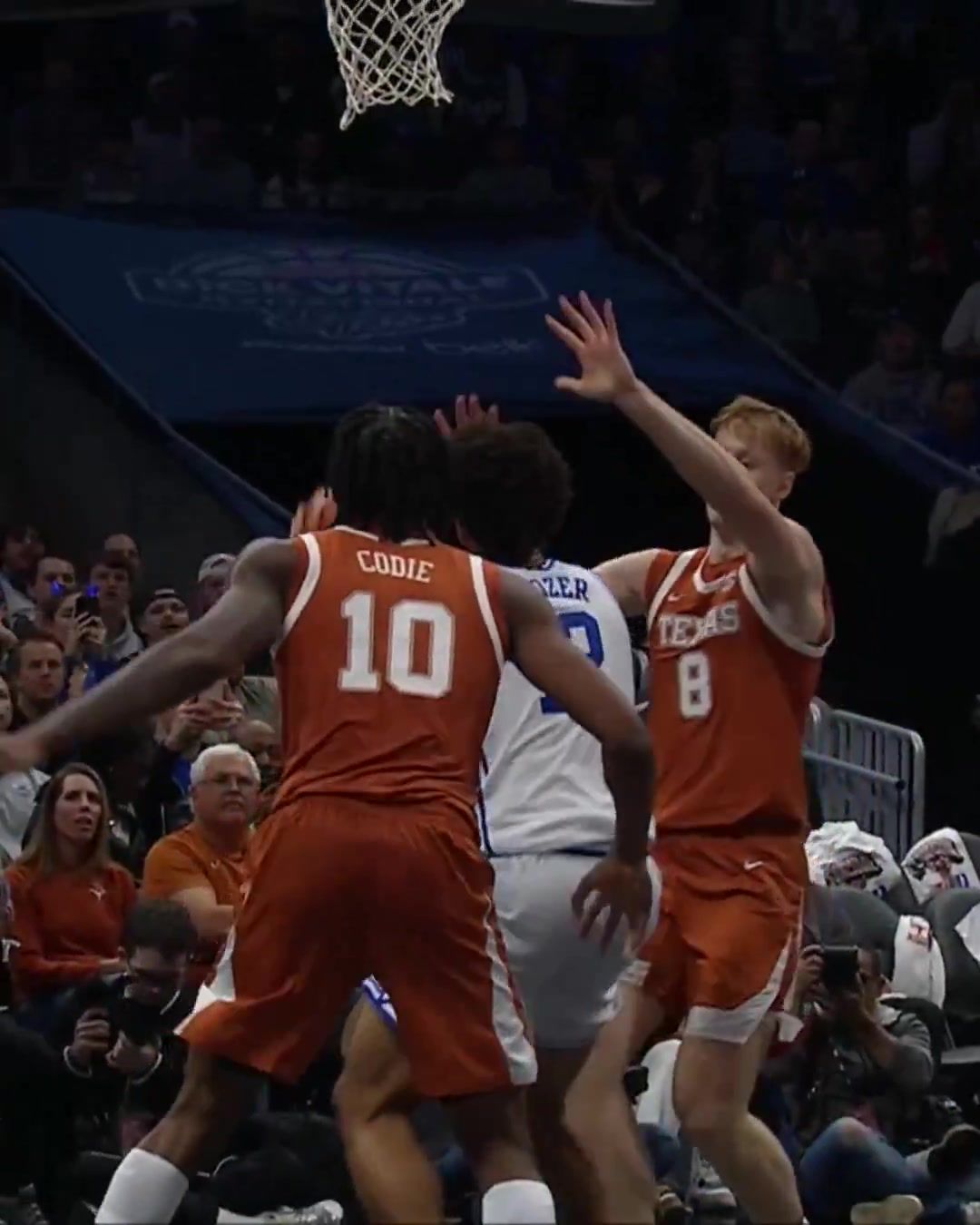 卡梅隆·布泽尔扣对手,父亲卡洛斯·布泽尔起立鼓掌 全场比赛,明年状元候选之一、杜克大学前锋卡梅隆·布泽尔上阵36分钟12投仅3中,三分4中0、罚球12中9,拿下15分13篮板2助攻3抢断1盖帽;杜克大学后卫凯登·布泽尔登场13分钟1投0中,罚球2中2,得到2分3篮板2助攻。 |