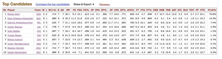 BBR最新MVP概率:约基奇70.8% SGA14.5% 东契奇因场次