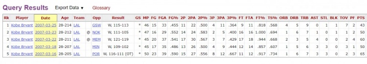 科比(268分) 2007年3月,科比曾在连续5场比赛里砍下268分。