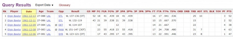 埃尔金·贝勒(251分) 1962年11月,贝勒曾在5场比赛里砍下251分。