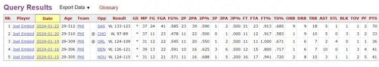 恩比德(221分) 2024年1月,恩比德曾在连续5场里砍下221分。