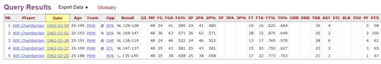 今天结束的一场NBA常规赛,湖人主场118-116战胜马刺。东契奇此役再次砍下高分,出战41分36秒,27中9,其中三分11中4,罚球17中13,得到35分9篮板13助攻5抢断2盖帽。 赛季前5场比赛,东契奇一共得到200分,场均40分,这已经是一个很棒的成绩。不过放在NBA的历史上,连续5场比赛200分还排不上号。今天老震为大家盘点一波NBA历史上那些连续5场比赛砍下至少220分的得分高手、他们的连续5场总得分的最高值(比如一名球员曾连续5场砍下300分,也曾连续5场砍下250分,本篇只回顾那次300分)。 张伯伦(351分) 1962年2月底到3月初,张伯伦曾在连续5场比赛里砍下351分。