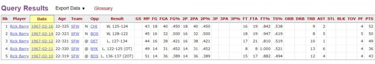 里克·巴里(230分) 1967年2月,里克-巴里曾在5场比赛里砍下230分。