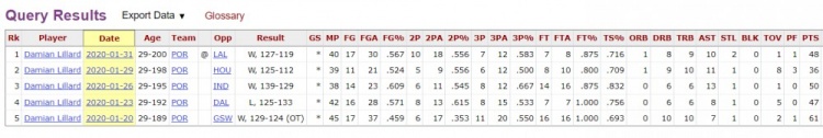 利拉德(242分) 2020年1月,利拉德曾在5场比赛里砍下242分。