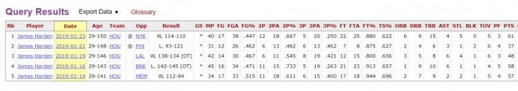 哈登(261分) 2019年1月,哈登曾在5场比赛里砍下261分。