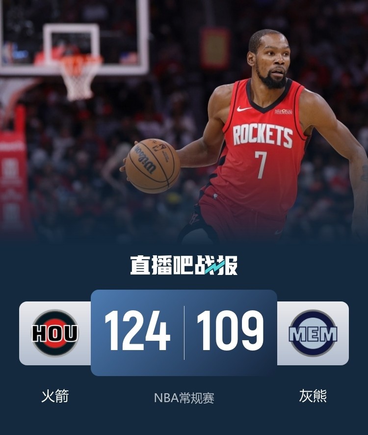 今日NBA常规赛,火箭队客场124-109战胜灰熊。 双方数据: 火箭(5-2):阿门28分10板7助2断、申京20分16板7助、伊森16分5板1助、史密斯16分4板2助、奥科吉13分3板3助2断、谢泼德12分1板1助2断、杜兰特11分4板5助、卡佩拉6分10板2助、泰特2分、格林1板、霍勒迪1助。 灰熊(3-6):斯潘塞19分2板2助、莫兰特17分5板8助、阿尔达马16分4板1助2断、兰代尔11分3板1助、威廉姆斯10分4板3助、杰克逊9分6板1助5帽、韦尔斯8分3板1助、科沃德7分9板4助2断、贝西4分5板1助、波普4分3板2助2断、霍尔2分2板1助、斯莫尔2分、普罗斯珀1板。