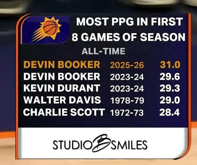 足球比分网11月7日讯 太阳主场迎战快船,转播方给出一项布克的队史纪录。 赛季前八场,布克场均砍下31分,是队史开季前八场的最高场均得分。 太阳赛季前八场场均得分前五如下: