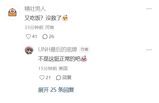该球迷与网友在评论区互动:吃饭,挺正常的吧。