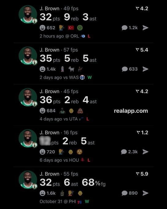 大当家!杰伦-布朗过去五场比赛四场砍下30+ 赛季