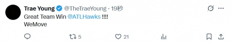 足球比分网11月9日讯 残阵老鹰主场122-102击退湖人,终结后者5连胜。 赛后,因右膝内侧副韧带扭伤休战的老鹰球星特雷·杨更推庆祝胜利,他写道:“非常棒的一场胜利!继续冲!”