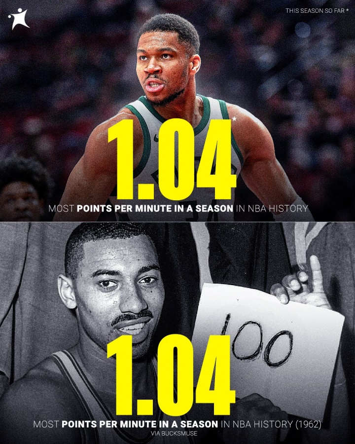 足球比分网11月10日讯 NBA常规赛,雄鹿115-122不敌火箭。 此役过后,雄鹿当家球星扬尼斯·阿德托昆博本赛季场均得分上涨至33.8分,场均出场时间为32.3分钟,他上场每分钟能得到1.04分,追平了NBA历史记录! 上一个能在每分钟里得到1.04分的还是1962年的威尔特·张伯伦。张伯伦该赛季场均出战48.5分钟,得到50.4分! 本场比赛,阿德托昆博出战35分钟24投15中,三分1中0、罚球14中9拿到37分8篮板3助攻1盖帽,有3失误。 |