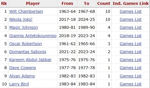 约基奇第11次以70+%命中率砍下30+三双 超张伯伦