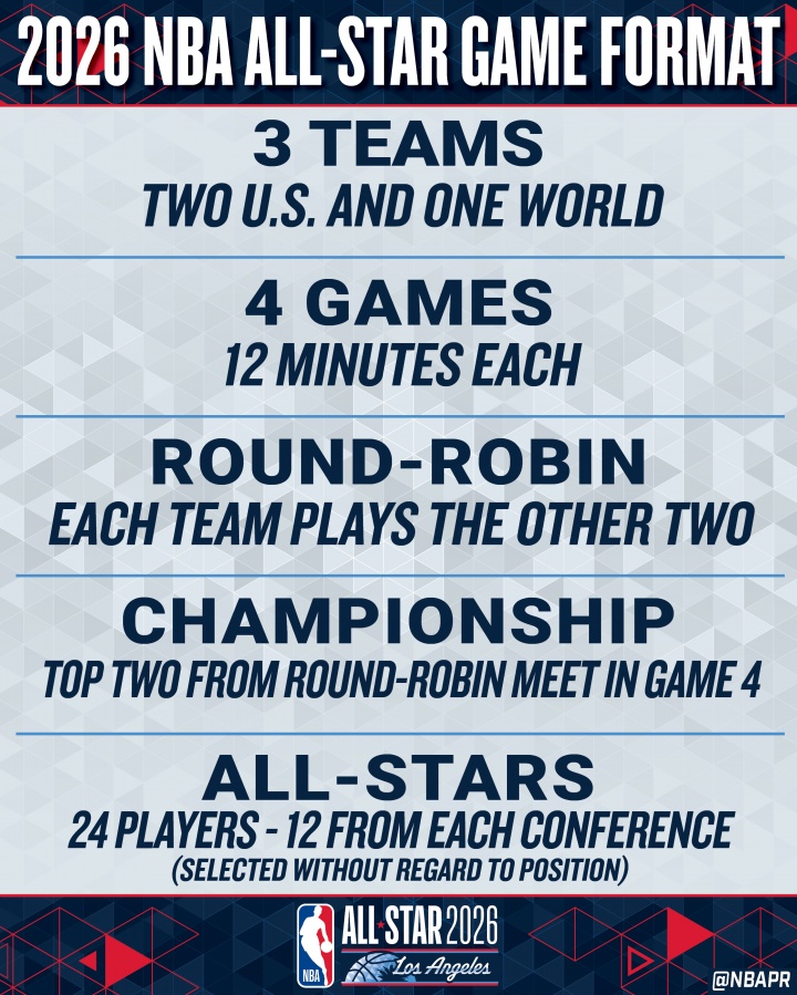 足球比分网11月12日讯 NBA官方今日官宣,2026年全明星将开启美国队VS世界队的全新赛制! 具体规则如下: 2支美国队和1支世界队(每队8名全明星)将参加组内循环赛,合计进行4场比赛,每场12分钟。 组内循环赛的前2名队伍将进入决赛争夺冠军。 今年的24位全明星,每个分区12名球星(5首发+7替补规则照常),但今年的全明星将不按位置区分进行选人。