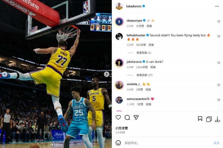 足球比分网11月12日讯 今天东契奇在INS上晒出了多张自己昨日比赛照,其中第二张是扣篮后的照片。 队友拉拉维亚和范德比尔特现身评论区,东契奇与他俩互动,具体如下: