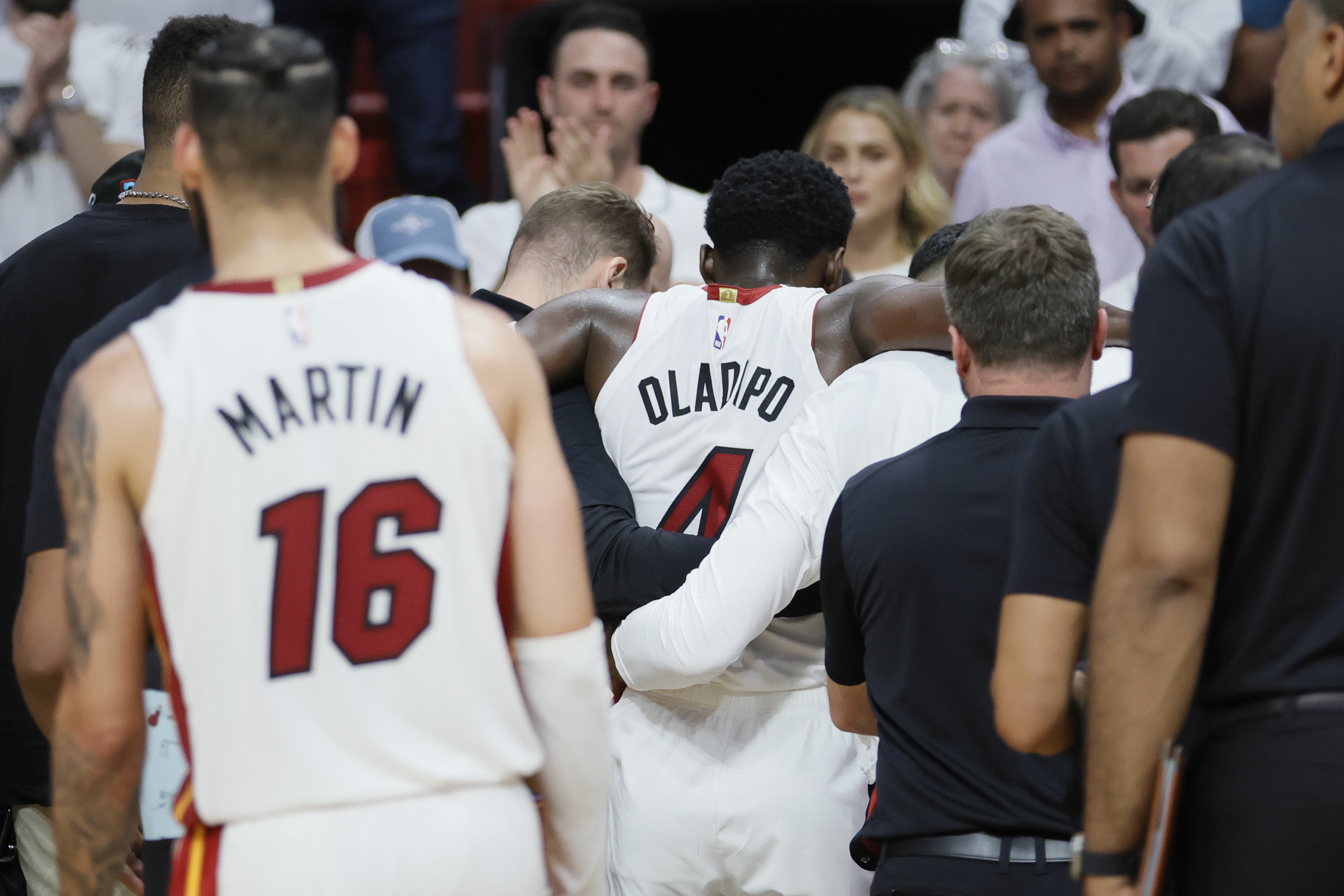 在接下来的三个赛季里,奥拉迪波总共只打了60场比赛,并在2021年5月效力于热火期间,再次接受了肌腱手术。那年夏天,球队与他续约,让他能够进行康复。他最终在那个赛季末段回归,并在2021-22赛季常规赛收官战中砍下40分。他成为了热火季后赛轮换阵容的一员。一切都重回正轨,即使他已不再是当年的明星。 然后,在2023年季后赛对阵雄鹿的比赛中,他突破杀向篮筐,起跳准备完成一记势大力沉的扣篮,这曾是他每晚的拿手好戏。 就在他起跳时,他的膝盖受伤了,髌骨肌腱撕裂,他重重摔倒在地板上。一切都结束了。这次肯定就是终点了。这样一次无对抗的受伤,似乎成了压垮他职业生涯的最后一根稻草。