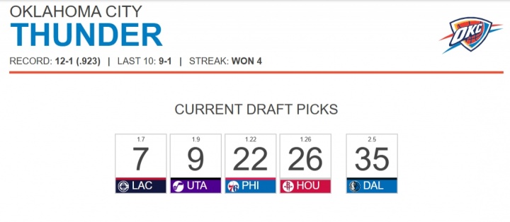 足球比分网11月13日讯 雷霆今日大胜湖人,继续巩固自己联盟第一的战绩;同时,快船今天输给了掘金。 恐怖的是,雷霆手握爵士和快船明年的首轮签,爵士和快船目前一个西部第10、一个西部第12,这也就意味着,雷霆手握的这两个首轮签大概率是乐透签(前14顺位); 按照目前的战绩来看,爵士的签大概率是第9顺位、快船的签大概率是第7顺位,这两个签也都有不同的概率变成状元签; 另外值得一提的是,雷霆明年还有来自火箭和76人的两个首轮,但这两个首轮签目前看起来没有乐透签的潜质,所以雷霆明年一共四个首轮!