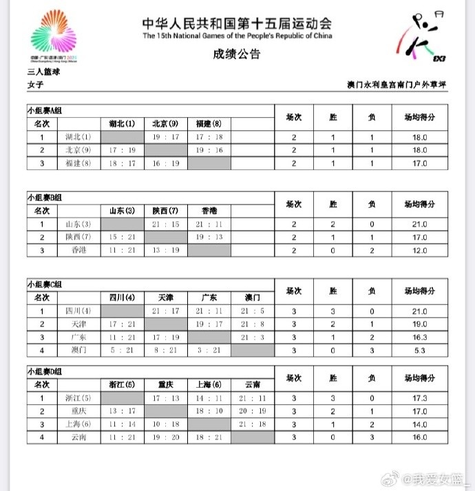 【全运会三人女篮第二日综述:八强对阵出炉 】 今日,第十五届全国运动会三人篮球项目比赛进入第二个比赛,小组赛阶段比赛也就此全部结束。1/4决赛对阵:湖北队vs天津队、浙江队vs陕西队、山东队vs重庆队、四川队vs北京队。 重庆队 13-17 浙江队。浙江队王佳琦贡献5分5篮板,万济圆5分,余佳锦4分,孙凤艺3分。重庆队李煜彦得到7分。 云南队 18-21 上海队。张芷婷是上海队发挥最为稳健的球员,她在内线10投9中,还有5个篮板,王悦贡献7分,潘雪梅5分。云南队娜汉8分,难挽败局。 中国香港队 11-21 山东队。山东队牢牢占据场上的主动,杨衡瑜11分,李文霞5分。 湖北队 17-18 福建队。本场比赛进行得一波三折,湖北队一度3-11落后,但后来居上,最终一分惜败,但仍幸运地获得小组头名出线。福建队林青容7分,赖婷艺6分,黄雅玲5分。湖北队陈玉婕7分,周梦云6分。 浙江队 14-11 上海队。官网暂无数据统计。 重庆队 20-19 云南队。重庆队李煜彦10分,阿呷娜婧5分,文星4分。云南队娜汉11分独木难支。 四川队 21-11 广东队。四川队苏蓥滢8分,张王来7分,四川队三战全胜头名晋级。广东队最后位列第3,未能出线。 中国澳门队 8-21 天津队。天津队顺利获得晋级资格,赵燕华9分。中国澳门队三战皆墨。 山东队 21-15 陕西队。山东队两战全胜以小组第一晋级,杨衡瑜独砍13分。 |