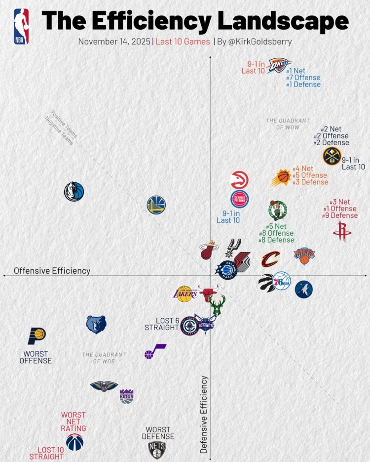 横轴代表进攻效率,越靠右越好,纵轴代表防守效率,越靠上越强。第一象限的球队多为发挥出色的球队,而在第三象限的球队通常为战绩比较糟糕的球队。