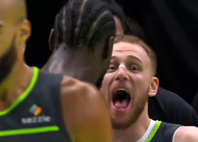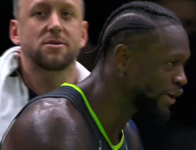 比赛最后时刻,威少压哨篮板达成三双,兰德尔转头对迪文说:“He got a Westbrook triple double(他拿了一个威少式的三双。).” 迪文则是表情夸张地回应兰德尔的言论。