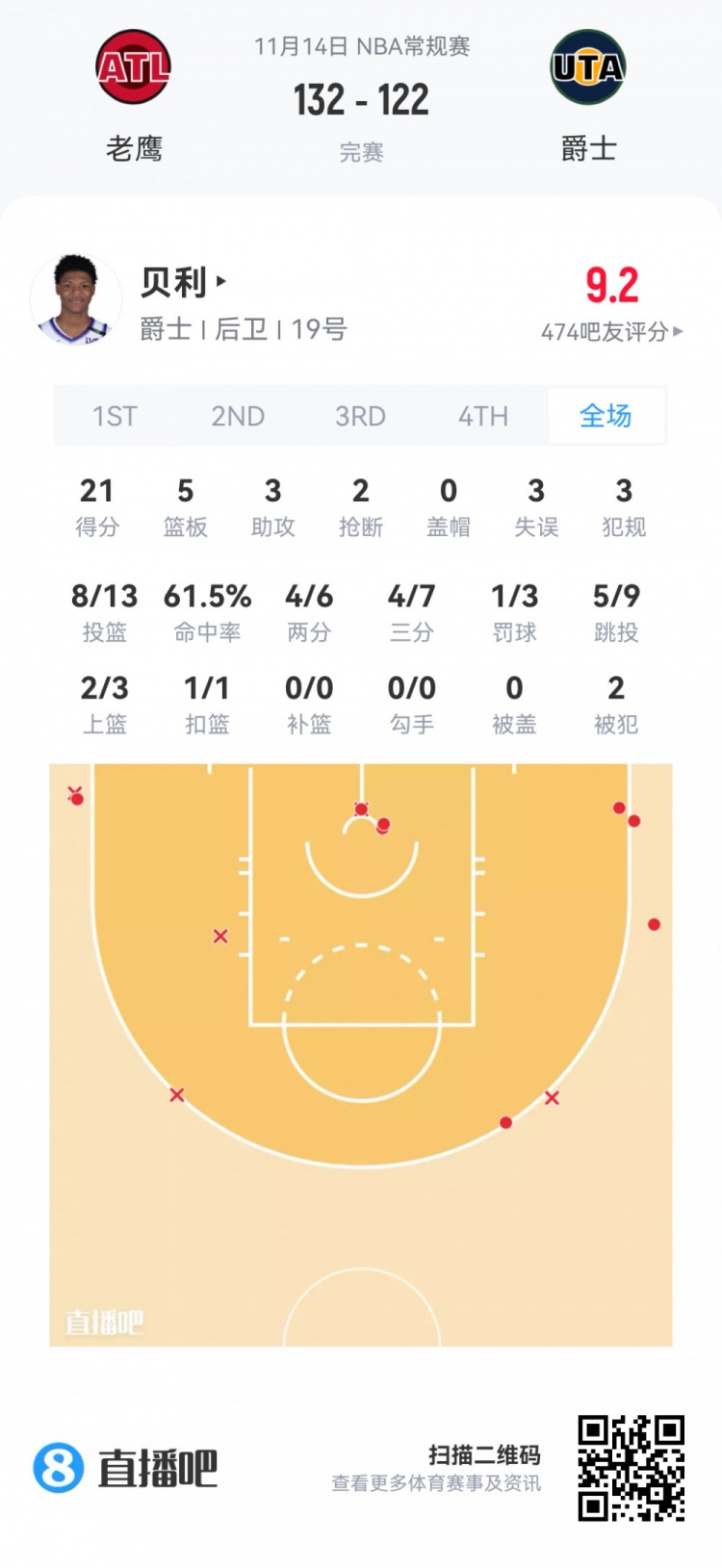 爵士首轮5号秀埃斯·贝利 登场31.8分钟
