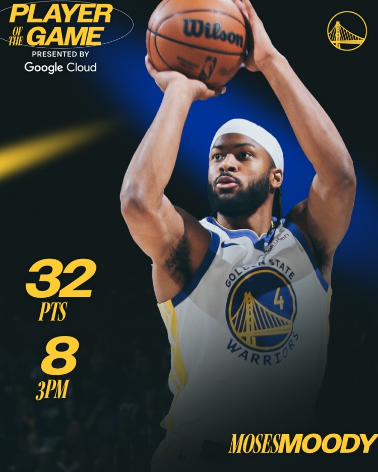 足球比分网11月17日讯 NBA常规赛,勇士124-106击败鹈鹕。 赛后勇士评选出本场最佳球员,砍下生涯新高的穆迪当选! 本场比赛,穆迪首节就火力全开,三分8中7独砍21分。全场穆迪16投10中,其中三分12中8,另外罚球5中4,砍下32分4篮板3抢断1盖帽,得分与三分命中数均为生涯新高!