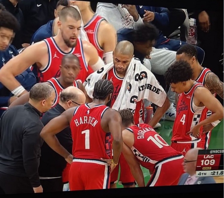 足球比分网11月17日讯 NBA常规赛,快船118-121惜败凯尔特人。 一位快船球迷赛后晒出了快船在最后21.8秒(当时哈登造成沃尔什三分犯规、裁判回看阶段)替补席图片,当时快船球员围着商讨战术,小范画战术,而主教练泰伦·卢在外圈看。 相关阅读: 解说:快船最后一攻战术设计堪称精妙 但应是小范画的&卢在最外圈 |