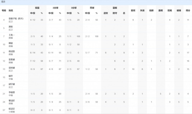 北京队方面,佟冠霖17分9篮板1助攻,张紫涵16分6篮板,柴梓涵15分7篮板10助攻。
