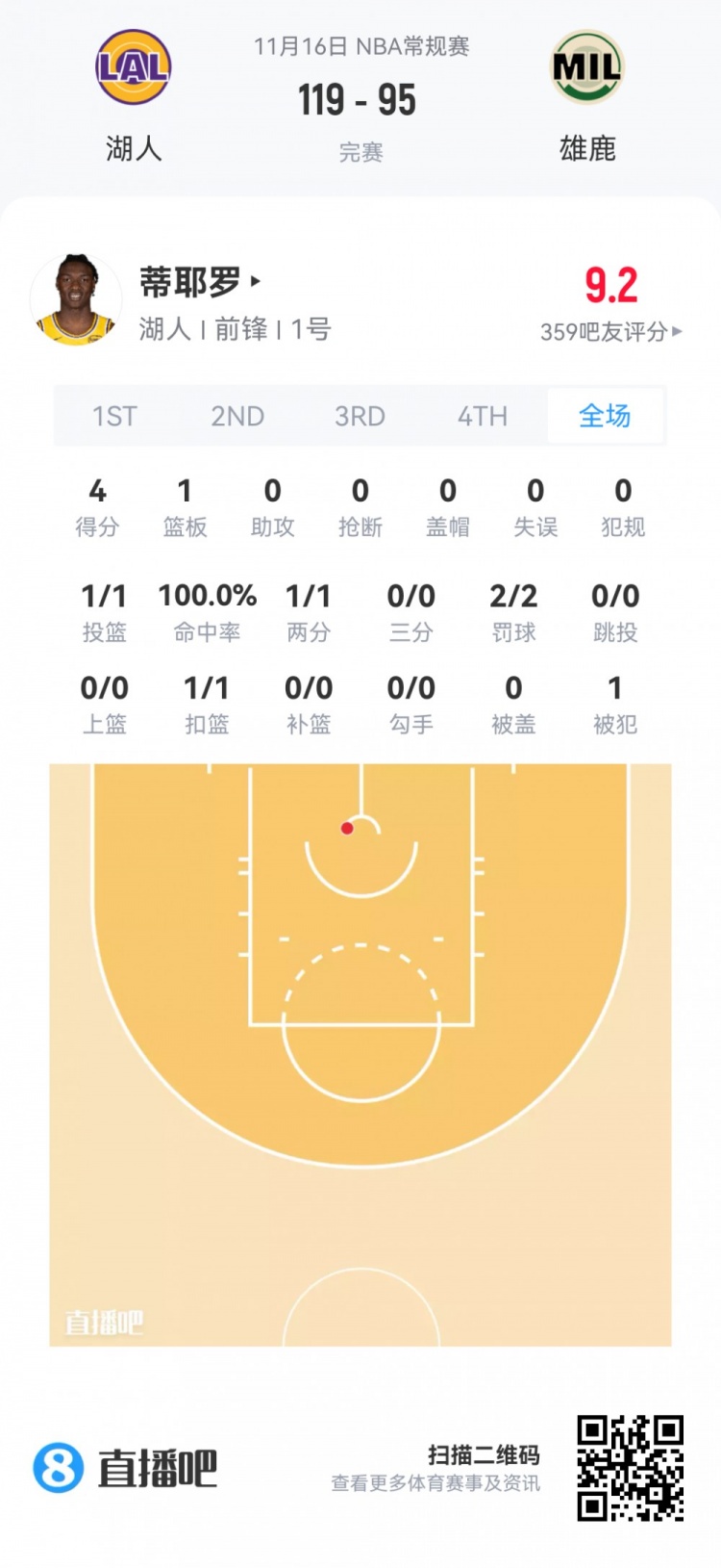 湖人次轮36号秀蒂耶罗 登场4.7分钟
