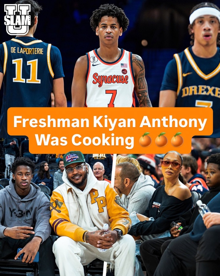 “甜瓜”安东尼和76人探花秀埃奇库姆现场观战 足球比分网11月16日讯 NCAA男篮常规赛,雪城大学在主场以80-50大胜德雷塞尔大学,喜提开季三连胜。 此役,名人堂成员卡梅隆·安东尼之子、雪城大学球员基扬·安东尼继续有着高效表现,本场比赛他首发上阵28分钟12投7中,三分2中1、罚球4中3,砍下18分3篮板,4失误略多,得分全场最高。