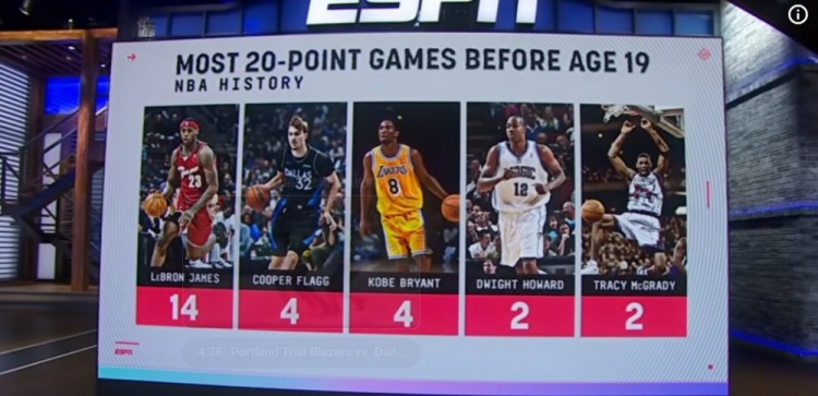 弗拉格19岁前砍下4场20+与科比并列历史第二 詹姆