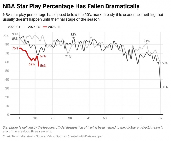 足球比分网11月19日讯 据记者Tom Haberstroh的统计和分析,本赛季至今,球星们的出勤率已经跌穿了60%,最新的数字是56%。这个数字放在以往赛季,通常是在赛季末段才会出现,本赛季开打还没多久,这一现象令人担忧! 据统计,NBA球星本赛季的缺席数量已经超过200场,是2023-24赛季同时段的两倍!NBA球员参赛政策中对球星的官方定义是:在过去三个赛季中至少入选过全明星或NBA最佳阵容的球员。本赛季,共有45名球员符合这一标准,这意味着平均每位NBA球星已经缺席了大约五场比赛。 另外,即使排除早就确定将长期缺阵的塔图姆、哈利伯顿、利拉德和欧文,明星球员在赛季首月的出场率也仅为75%,远低于两年前的87%。
