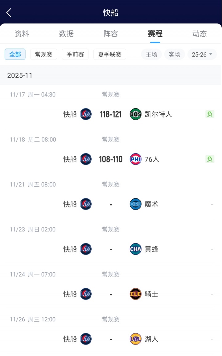 目前4胜10负西部第12!已遭遇2连败的快船接下来 时间: 2025-11-19 来源: 网络 作者: admin 上一篇:去年今日:哈登三分命中数超越雷·阿伦 升至历 下一篇:拉加·贝尔:快船又老又没防守 失去鲍威尔对他