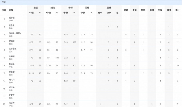 河南队方面,黄晓驰30分3篮板1助攻,贾嘉锴12分7篮板2助攻。