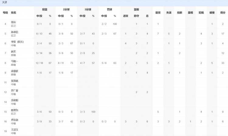 天津队方面,马如一33分5篮板2助攻,孙承信17分4篮板7助攻。