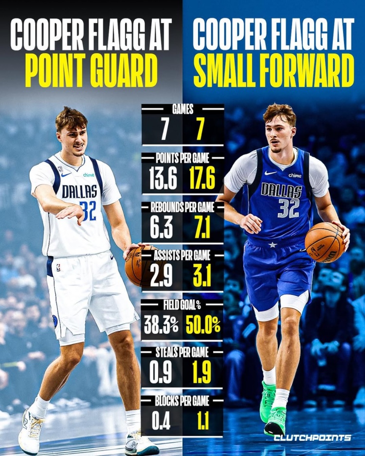弗拉格打控卫的七场比赛,场均13.6分6.3篮板2.9助攻0.9抢断0.4盖帽,命中率38.3%; 打小前锋的七场比赛,场均17.6分7.1篮板3.1助攻1.9抢断1.1盖帽,命中率50.0% |