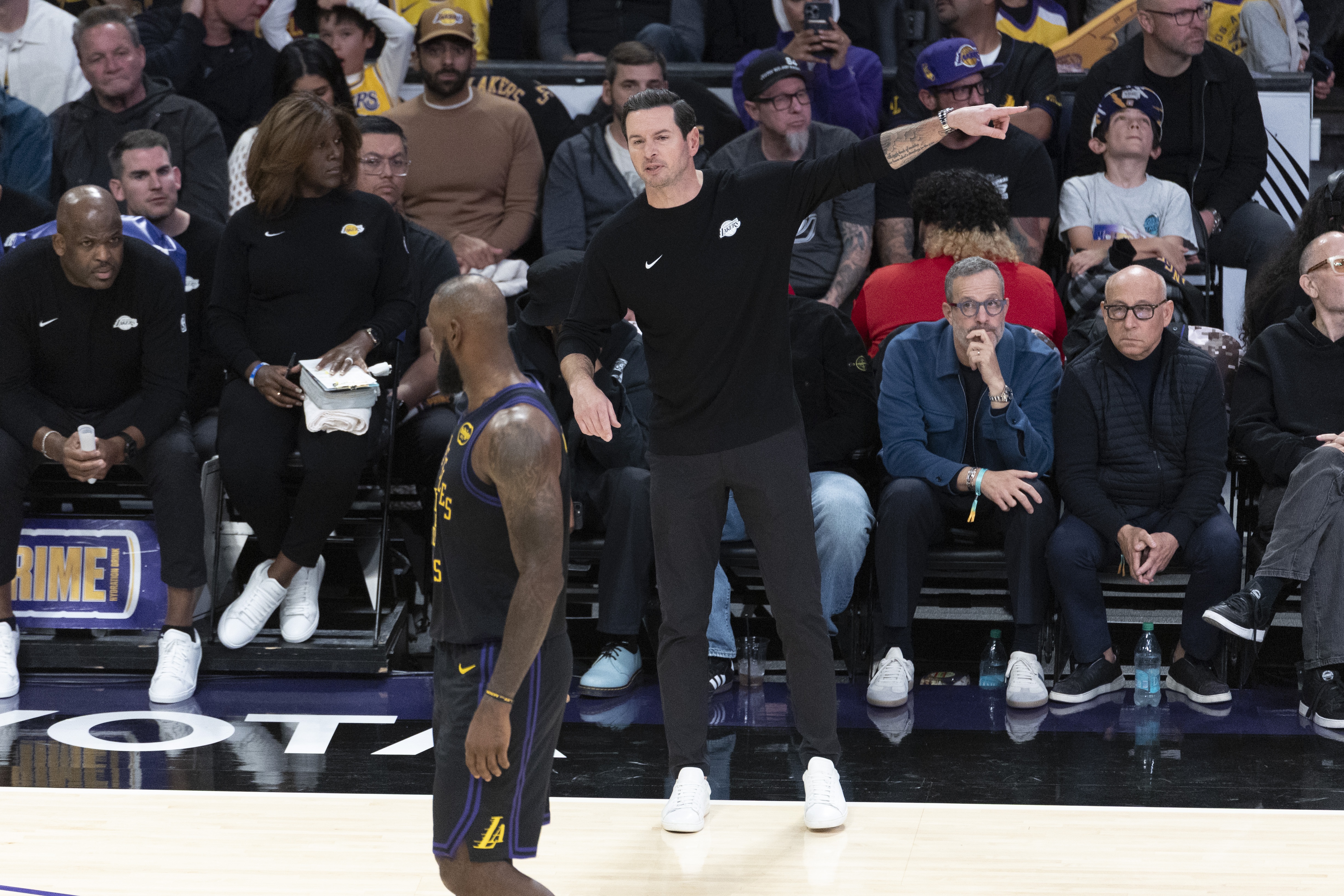 所以在周二以140-126战胜爵士的比赛中,湖人的队内氛围并未真正受到破坏,那种由东契奇和奥斯汀·里夫斯在开赛前14场比赛中创造的、互喷垃圾话却又亲密无间的氛围依然存在。此前一个多月建立起的成果,并没有笼罩在所谓的“王者阴影”之下。有的只是更多美好的时光——一位历史级巨星融入其中并大放异彩,因为他终于重返赛场了。 詹姆斯得到的11分是他历年揭幕战的第二低,而12次助攻则是第二高。 “我可以融入任何阵容,”詹姆斯赛后说道,“我甚至不明白为什么这会成为一个问题。这些人怎么了?我可以和任何人并肩作战。”