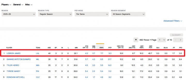 足球比分网11月28日讯 湖人球星詹姆斯在缺席开季14场比赛后复出已打3场比赛。 根据官网数据统计,詹姆斯的场均快攻得分7.7分已超越字母哥(6.5)来到联盟第一。