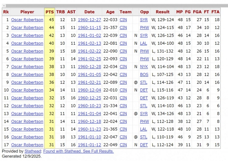 今天结束的一场NBA常规赛,鹈鹕主场132-135不敌马刺。不过13号秀奎因打出精彩数据,他出战33分06秒,15中11,其中三分2中0,罚球13中11,得到33分10篮板10助攻4盖帽,正负值+14。 菜鸟打出30+三双,这在NBA并不常见,今天,老震为大家盘点一波NBA历史在新秀赛季砍过30+三双的球员,一共13人。 埃尔金·贝勒(1958年状元) 1958年11月,24岁的贝勒在对阵锡拉丘兹民族队的比赛中22投12中,15罚13中,砍下37分14篮板10助攻。湖人最终121比102取胜。 奥斯卡·罗伯特森(1960年状元) 1960-61赛季,罗伯特森17次砍下30+三双,其中得分最高的一次是45分12篮板13助攻。