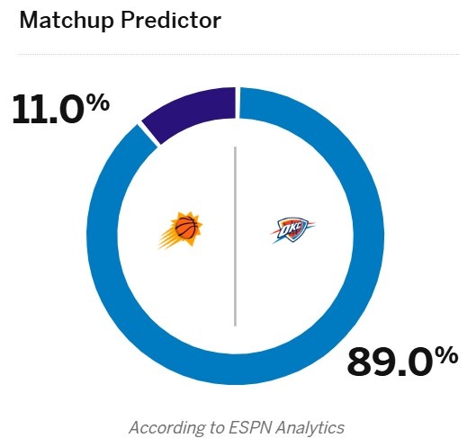 足球比分网12月10日讯 明天上午8点30,雷霆和太阳的NBA1/4决赛将开打。 今天,ESPN预测本场比赛胜率,雷霆89%,太阳11%。